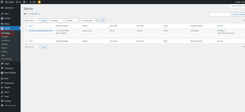 The All Booking section in the Salonly Plugin provides a complete overview of all bookings created through your salon’s booking system. It allows administrators to view, manage, and filter all customer bookings efficiently from a single interface.