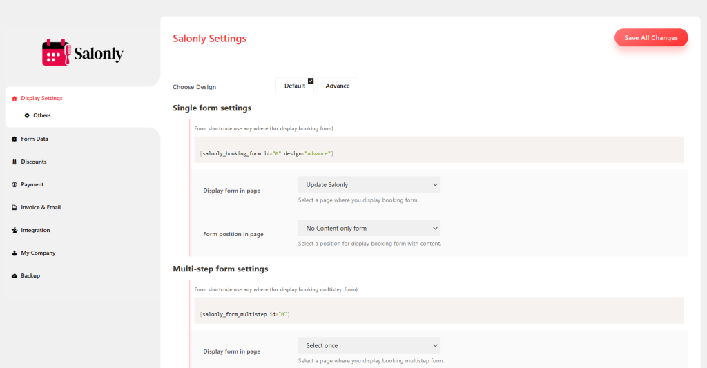 Use the shortcode below to display the single booking form anywhere on your site:[salonly_booking_form id="x" design="advance"]Replacexwith your booking form ID. - Display Form in Page