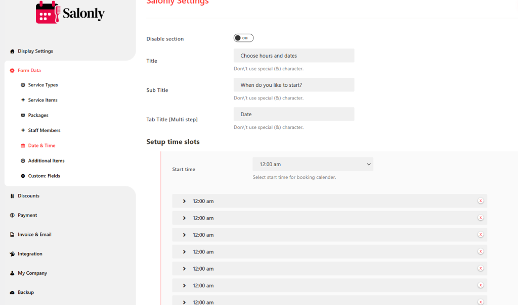 Salonly → Form Data → Date & Time - You’ll see the “Setup time slots” and “Time settings” sections.