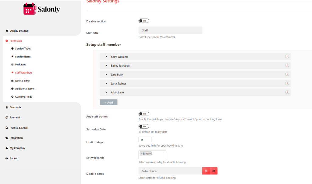 The Staff Member Settings section in the Salonly Plugin allows you to manage and display staff details in your booking form. This configuration helps connect your staff profiles with specific services, availability, and booking limits.