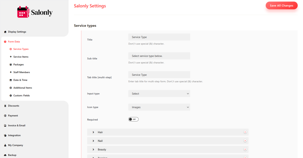 In this section, you can define multiple service types (categories) such as Hair, Nail, Beauty, Spa, etc.
