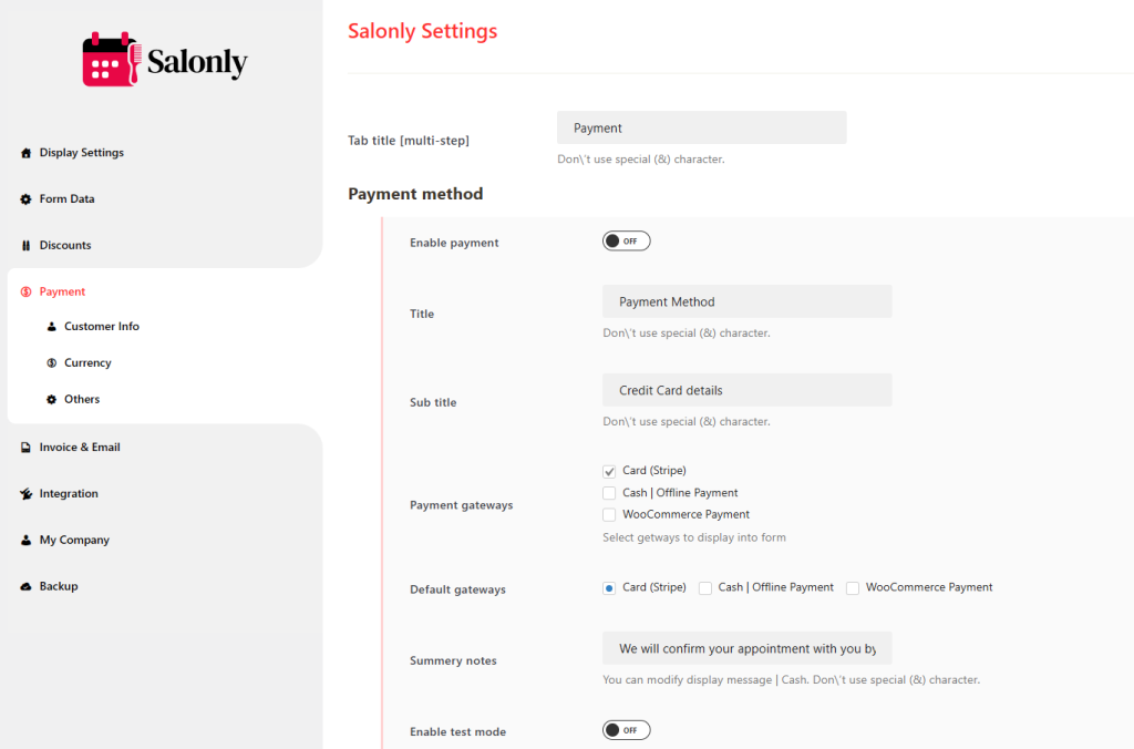 The Payment Settings section in the Salonly Plugin allows you to configure and manage how customers pay for their bookings. You can enable multiple gateways like Stripe, Cash / Offline Payment, and WooCommerce Payment to give users flexible payment options.